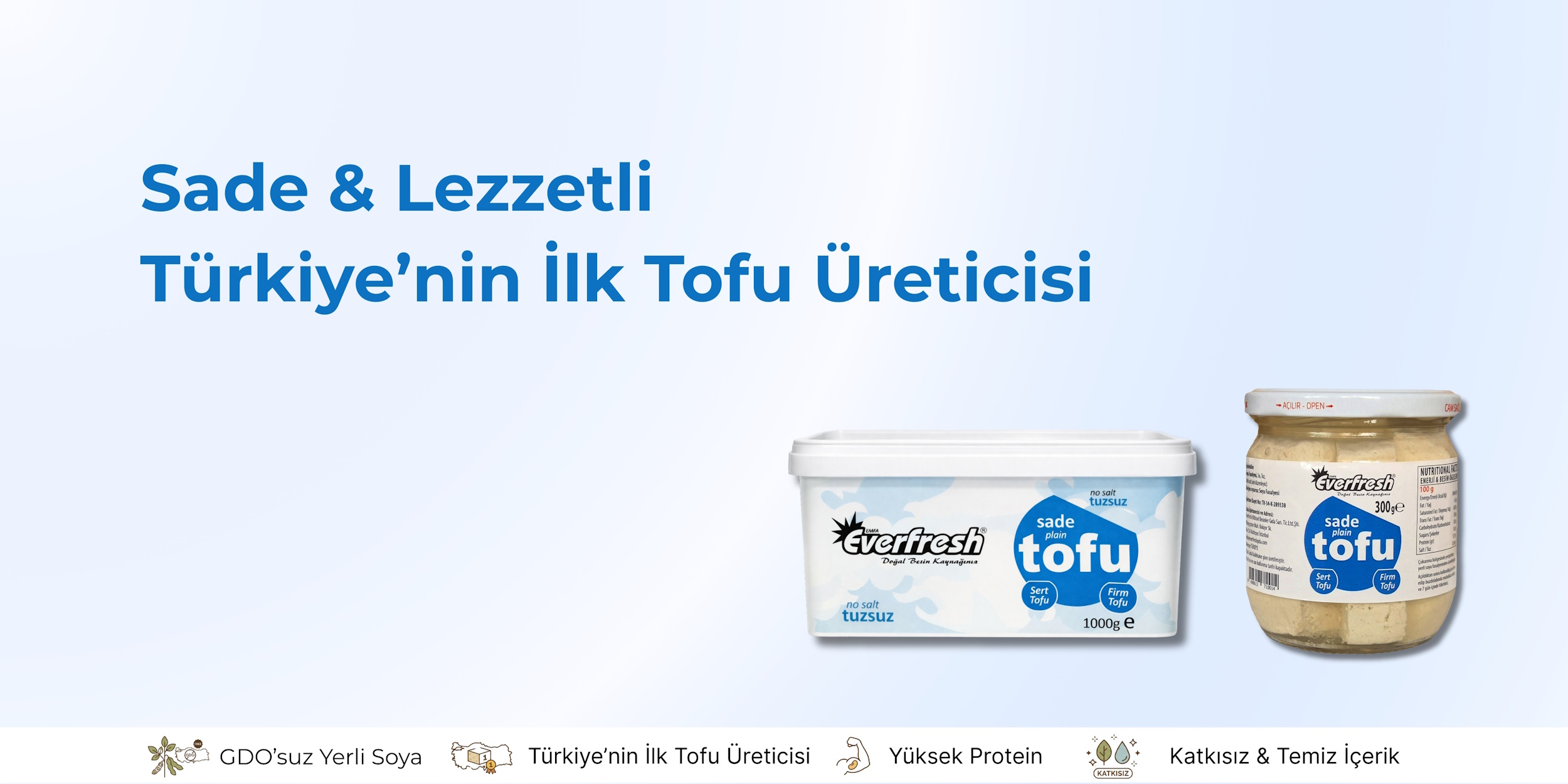 Türkiye’de sağlıklı cam ambalaj kullanan ilk ve tek tofu üreticisi olarak, ürünlerimizin hem içeriğine hem de saklama koşullarına aynı özeni gösteriyoruz. Everfresh Tofu, tamamen geleneksel yöntemlerle, hiçbir katkı ve koruyucu madde eklenmeden üretilir. Dengeli dokusu ve nötr tadı, lezzetini kullandığınız tariften almasını sağlar.