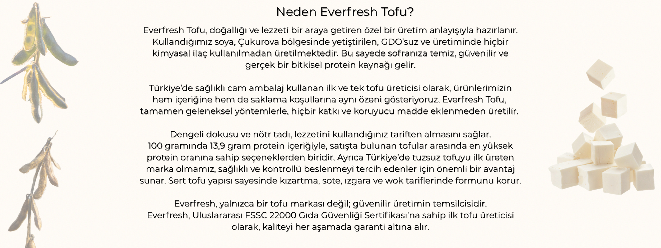 Everfresh, Uluslararası FSSC 22000 Gıda Güvenliği Sertifikası’na sahip ilk tofu üreticisi olarak, kaliteyi her aşamada garanti altına alır.